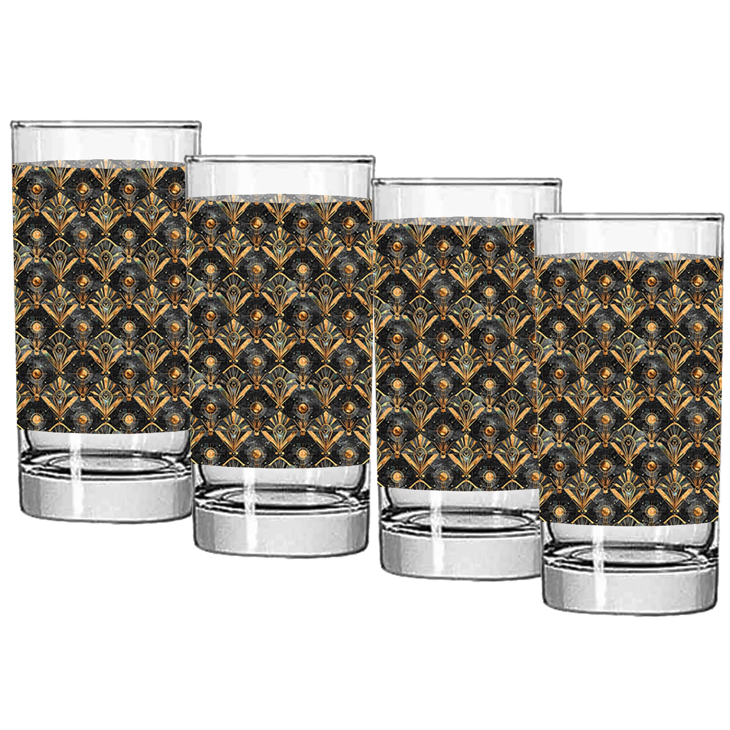 On the highball glass, Astral Glow becomes cinematic in midnight black, grounding the look while turquoise accents lift the design into something almost electric. The vertical form gives the Egyptian ember motifs a clean, rhythmic flow that feels futuristic and sophisticated. It’s a showpiece for cocktails that deserve atmosphere and intrigue.