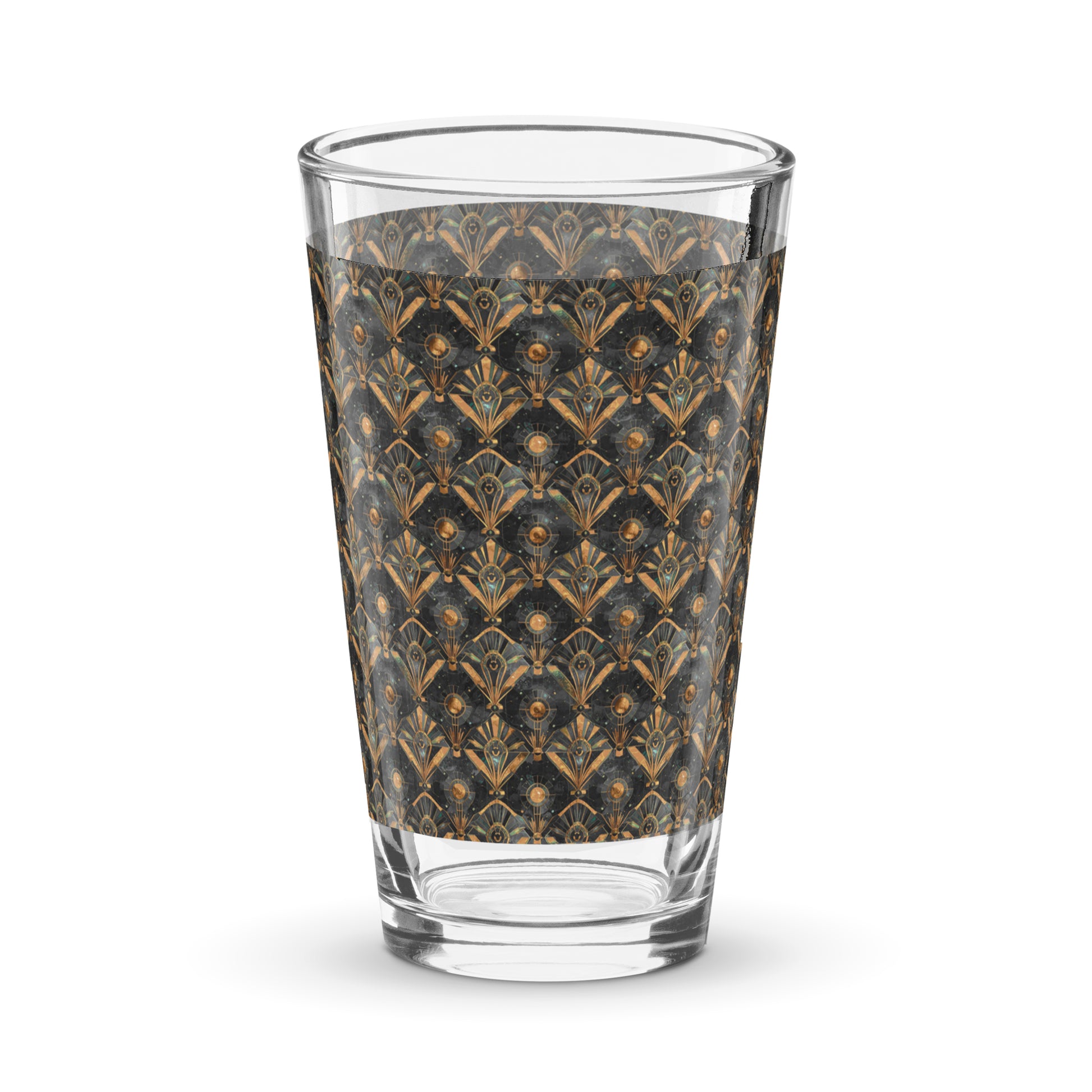 Midnight Marrakech transforms the pint glass into something unexpectedly luxe with its classic shape, wrapped in smoky black richness and brushed gold detail that feels curated. The Moroccan pattern brings bohemian charm to an everyday pour, while blue accents add a subtle, moody contrast. It’s casual, elevated, and instantly distinctive.