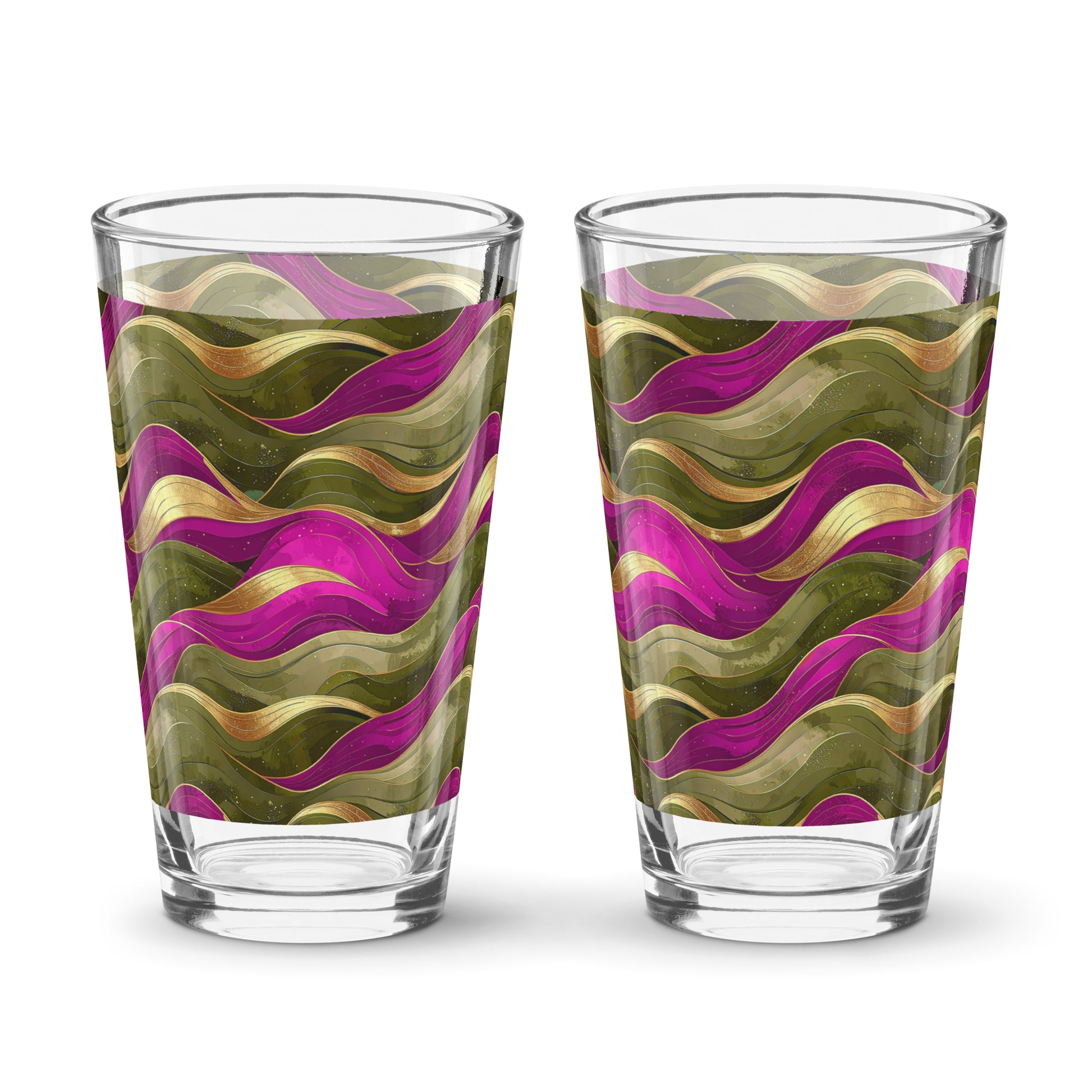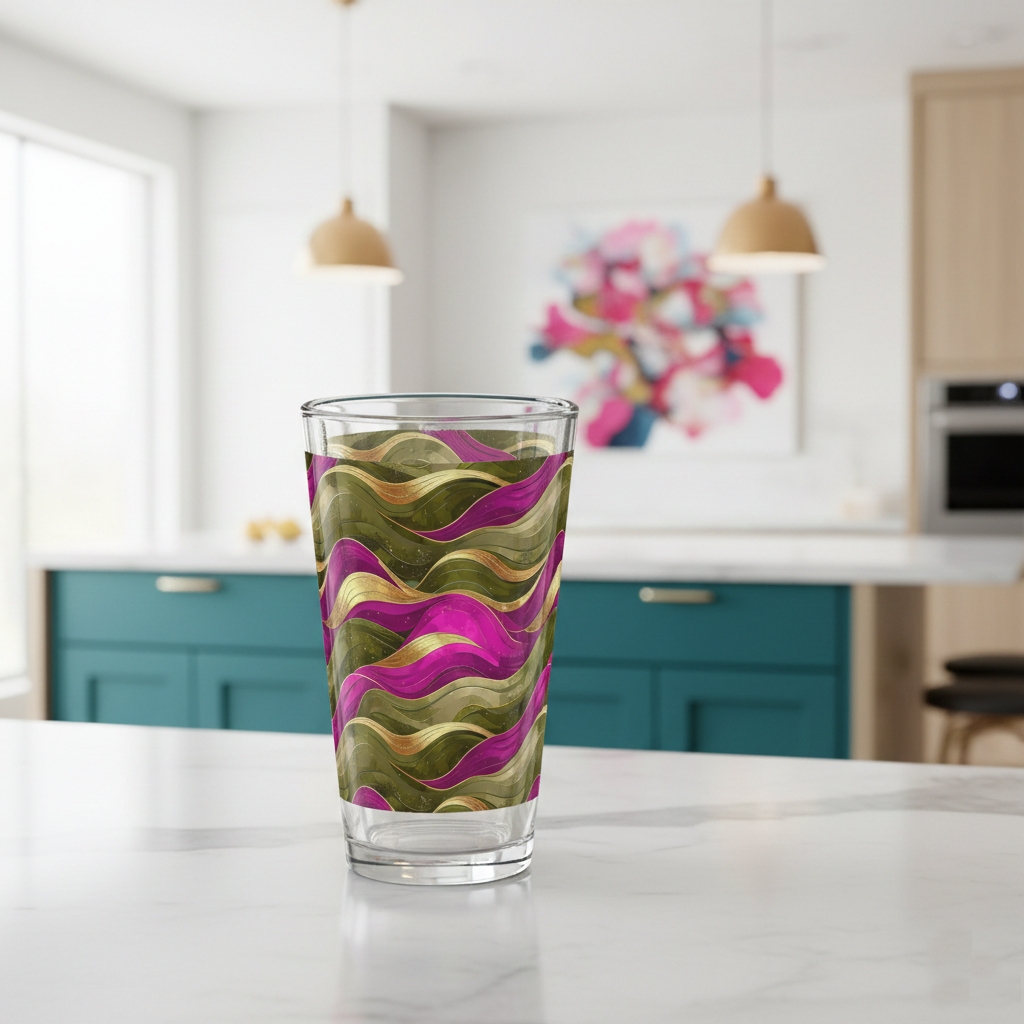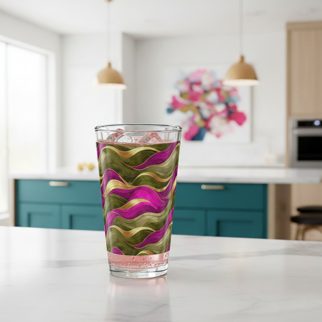 The pint glass brings lively energy to our Aurelian Dusk signature design. The glass shape lets the waves in magenta, olive, and gold stretch upward like rising motion, enhancing the vibrancy of light beers, ciders, and seasonal brews. Perfect for casual gatherings that still deserve a refined touch of holiday luxury.