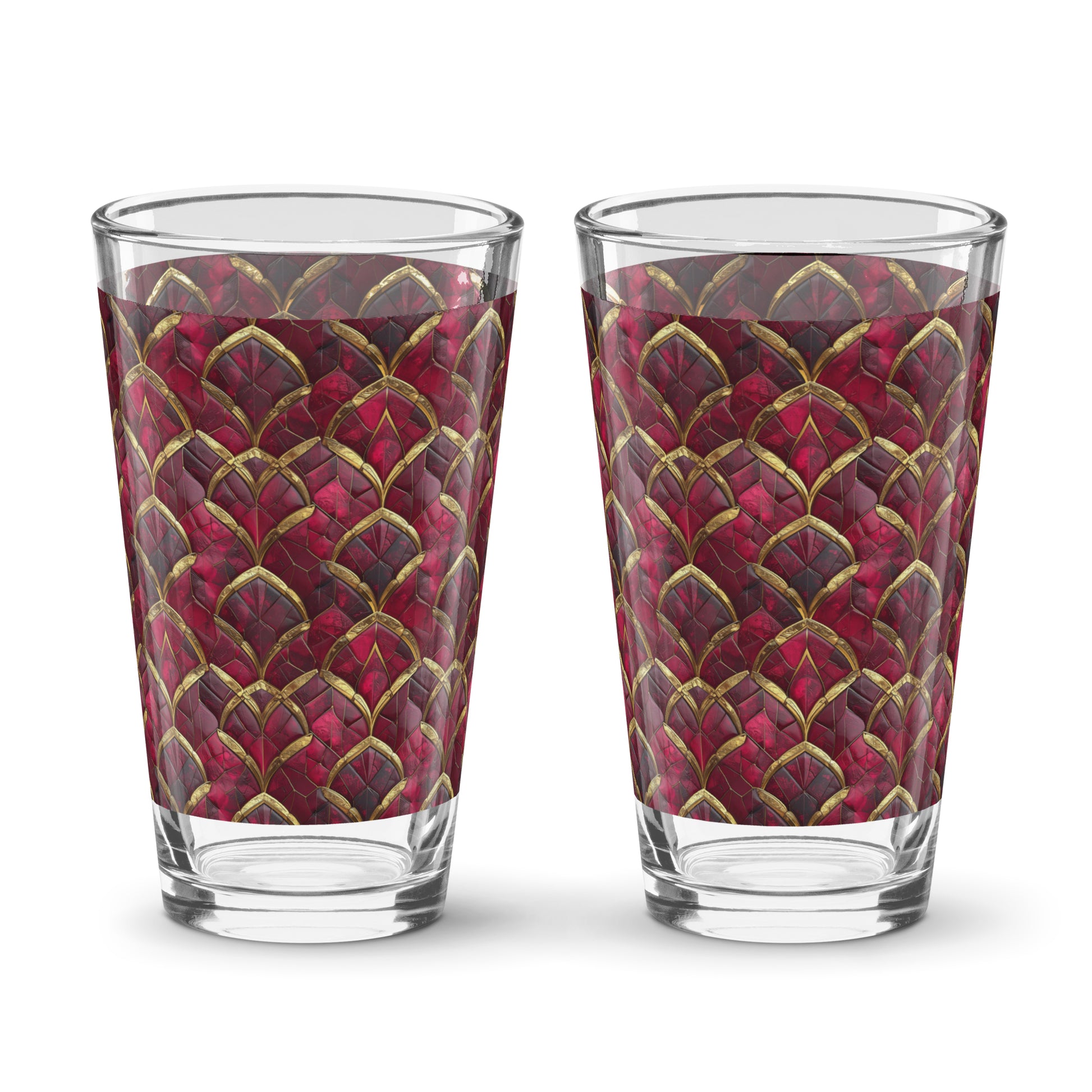 The pint glass brings a luxurious twist to our Crimson Jewels signature design. The regal ruby tones and gleaming gold motifs stretch upward in rhythmic elegance, giving beer, cider, or seasonal brews a rich, celebratory stage. Perfect for hosts who appreciate upscale artistry in even the most relaxed settings.