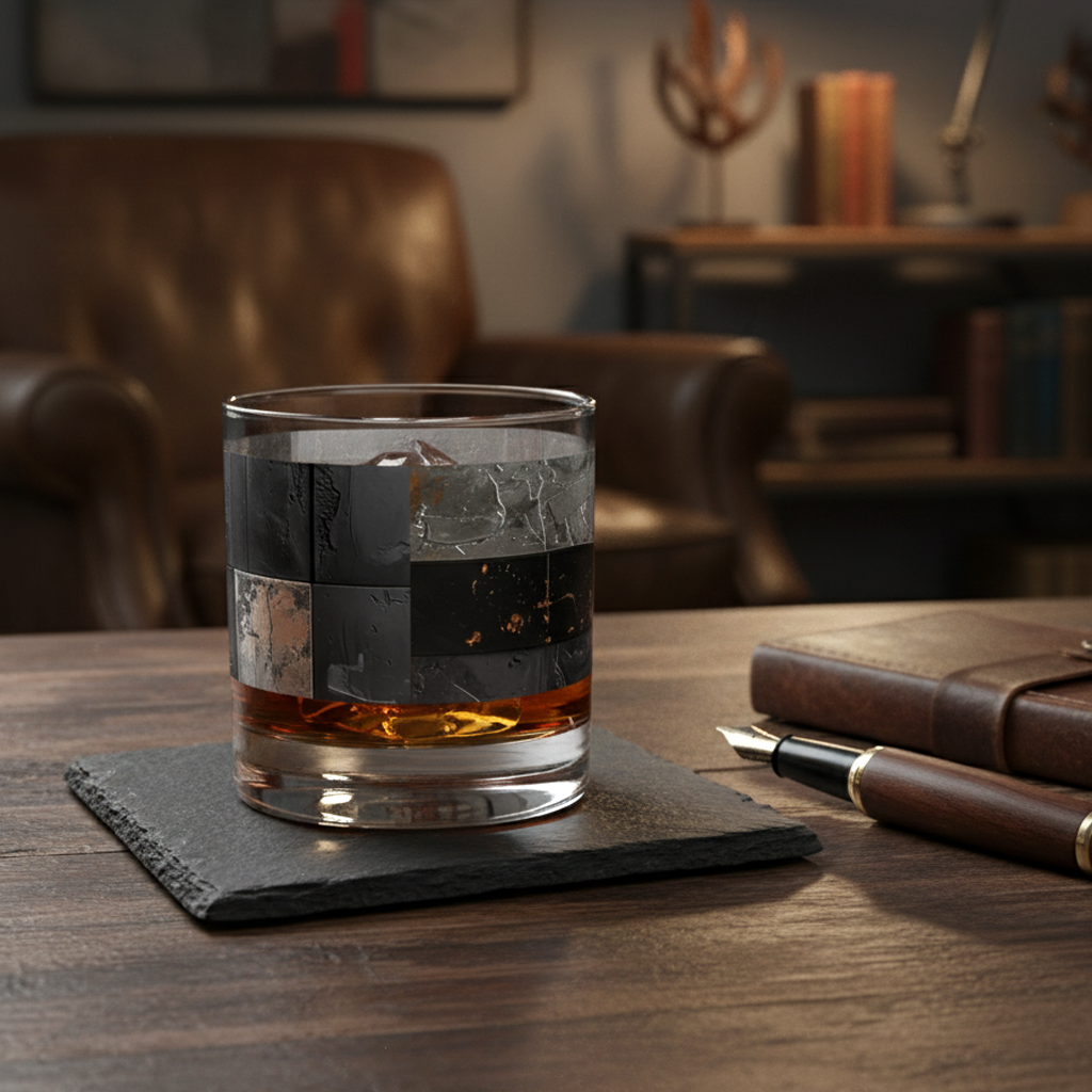 Sturdy and architectural, the rocks glass highlights the sculptural nature of the Fresco Fragments design. The textured metallic squares appear almost chiseled, glowing through whiskey, bourbon, or crafted cocktails with rich gravitas. This is a glass that feels like a relic of old-world artistry that is substantial, elegant, and timeless.